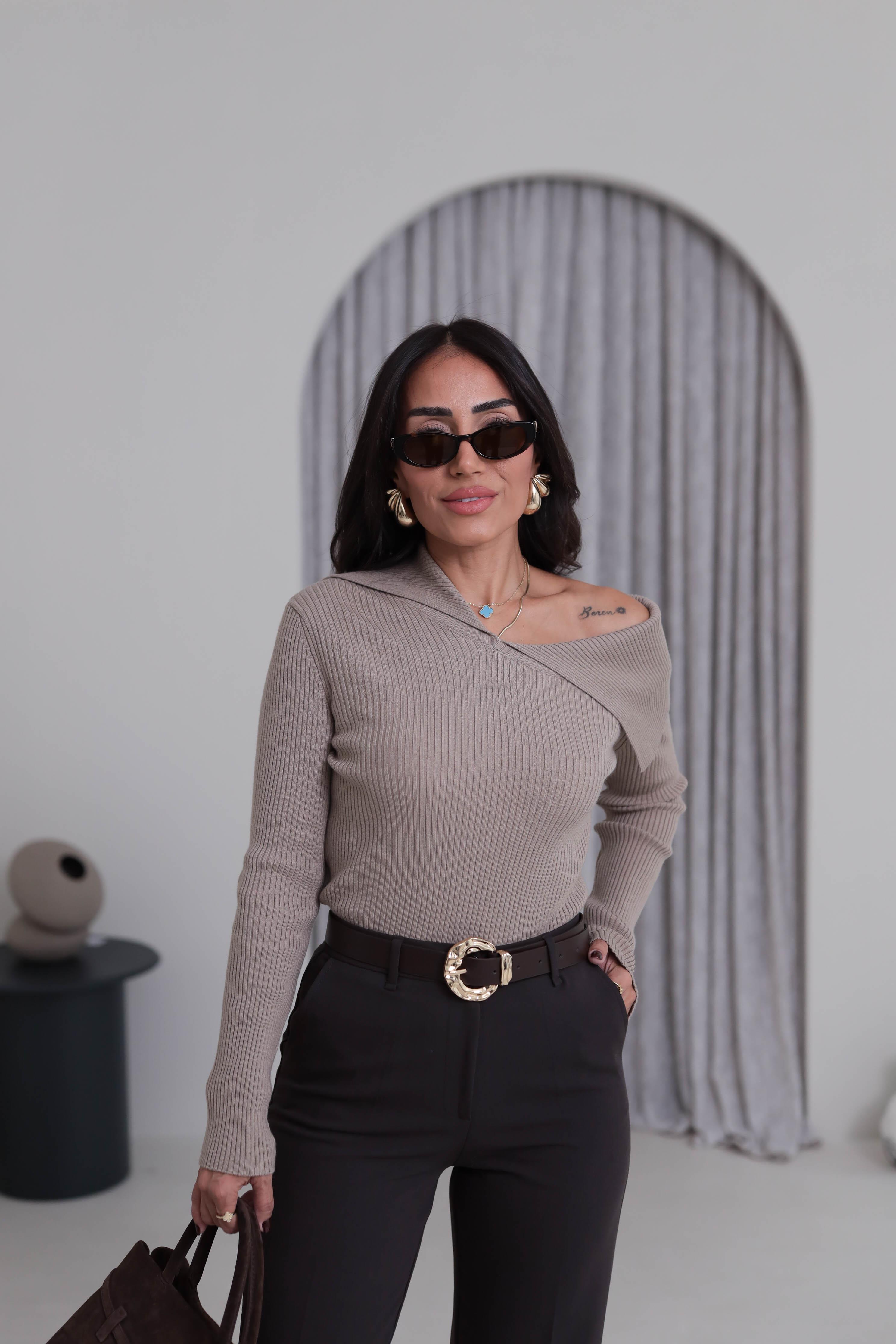 0815 Asimetrik Yaka Fitilli Triko Kazak VİZON (P-000007420)