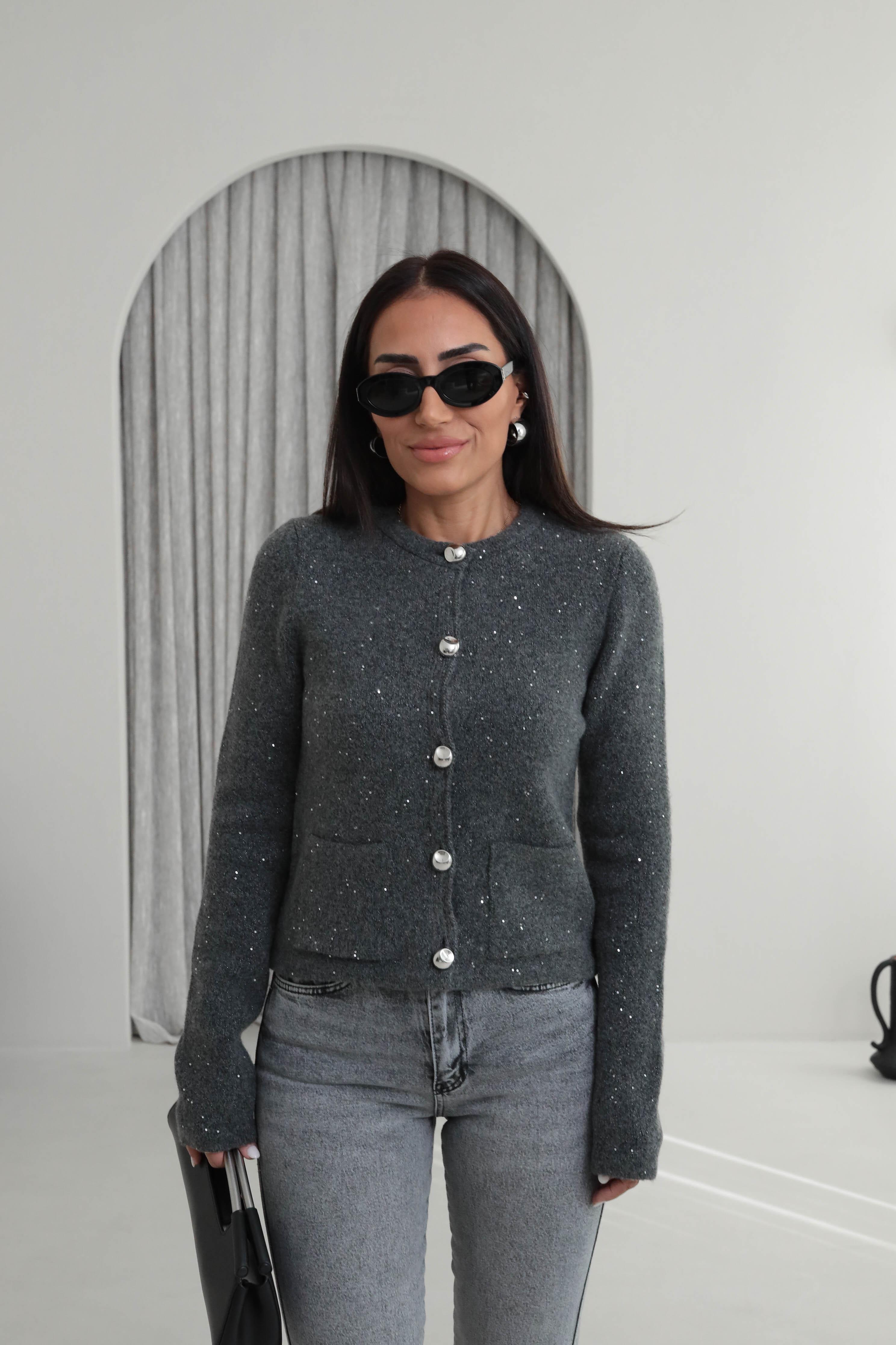 0935 Bisiklet Yaka Pullu Simli Düğmeli Triko Hırka FÜME (P-000007303)