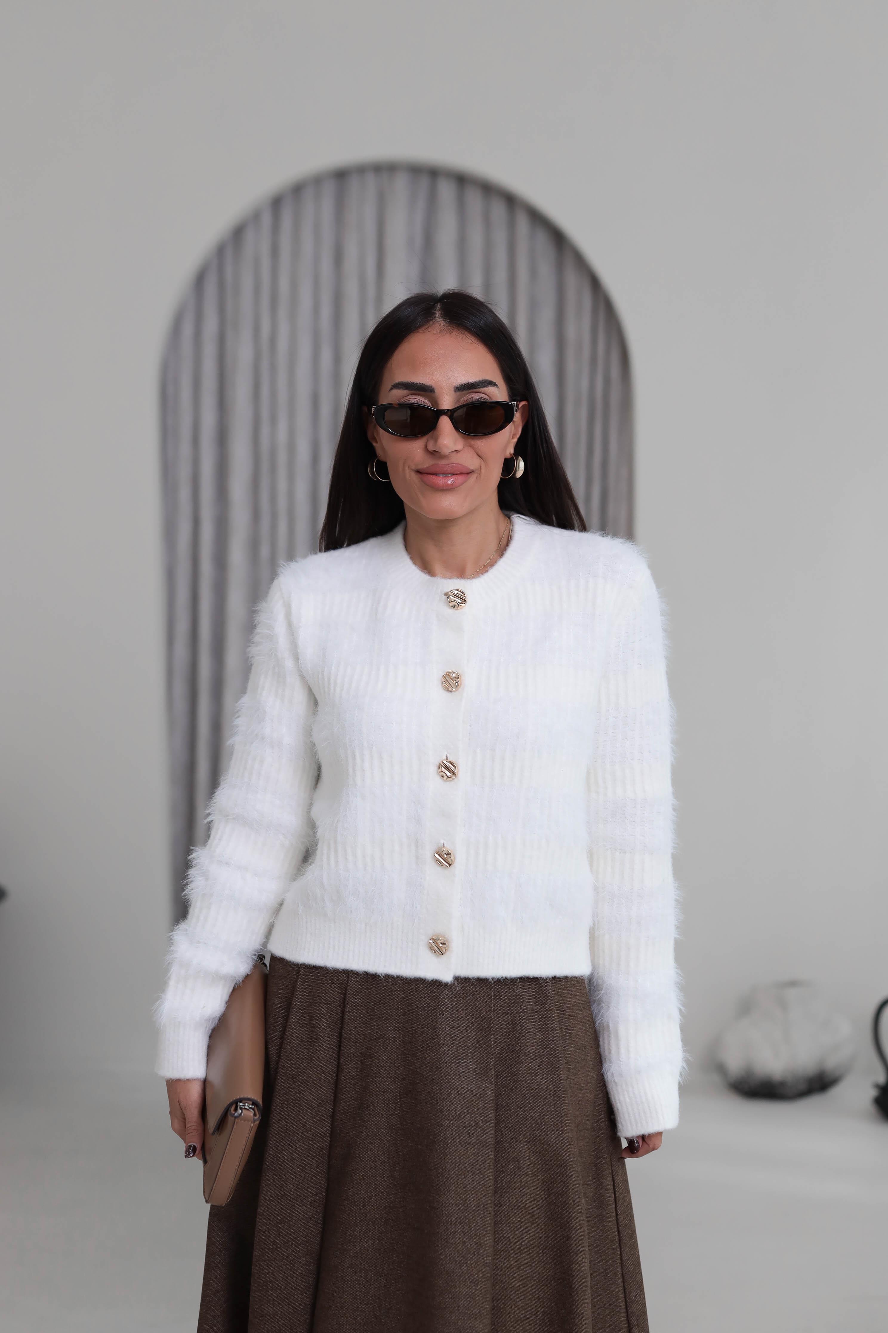 0990 Bisiklet Yaka Yumuşak Dokulu Gold Düğmeli Triko Hırka EKRU (P-000007421)