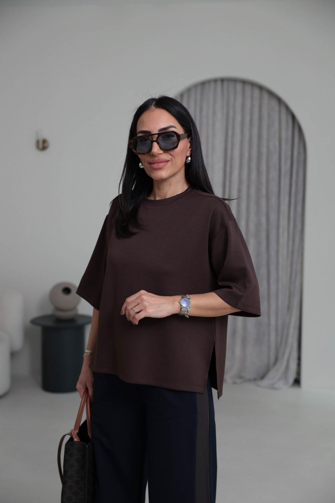 1066 Yanları Yırtmaçlı Bisiklet Yaka Modal Tshirt ACI KAHVE