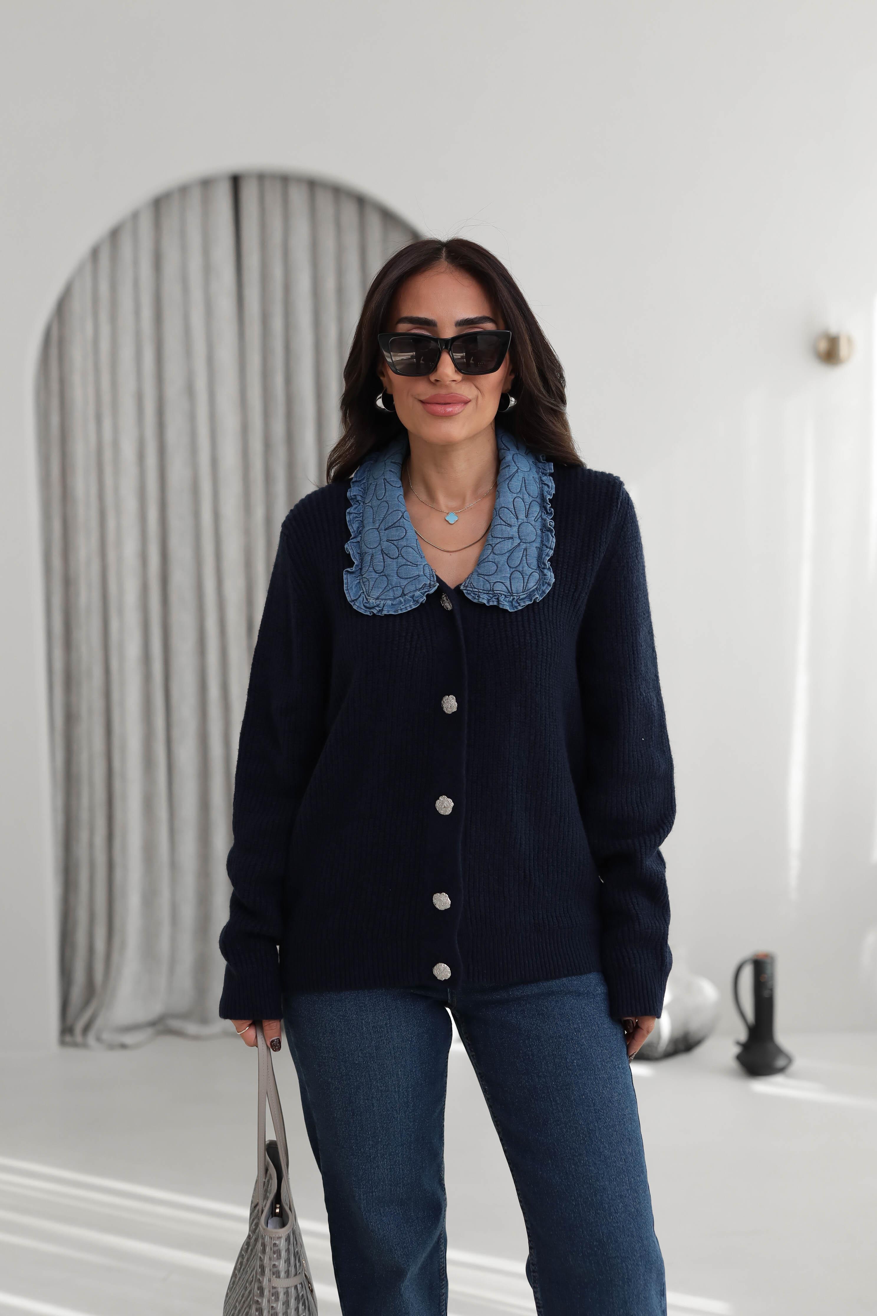 1105 Yakası Kapitone Kot Kumaş Detaylı Hırka LACİVERT (P-000007498)