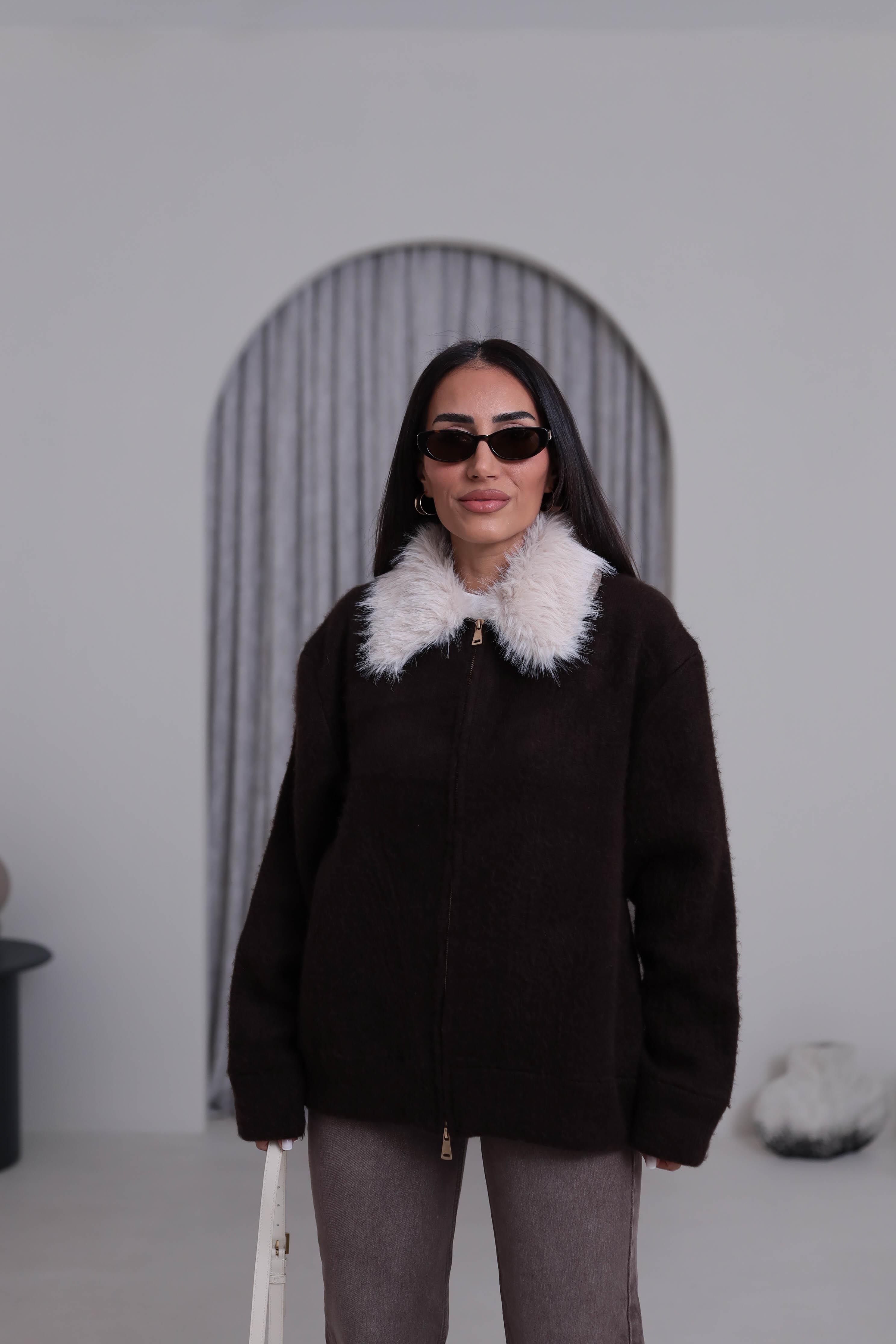 6874 Çıkarılabilir Kürk Yakalı Triko Hırka ACI KAHVE (P-000007529)