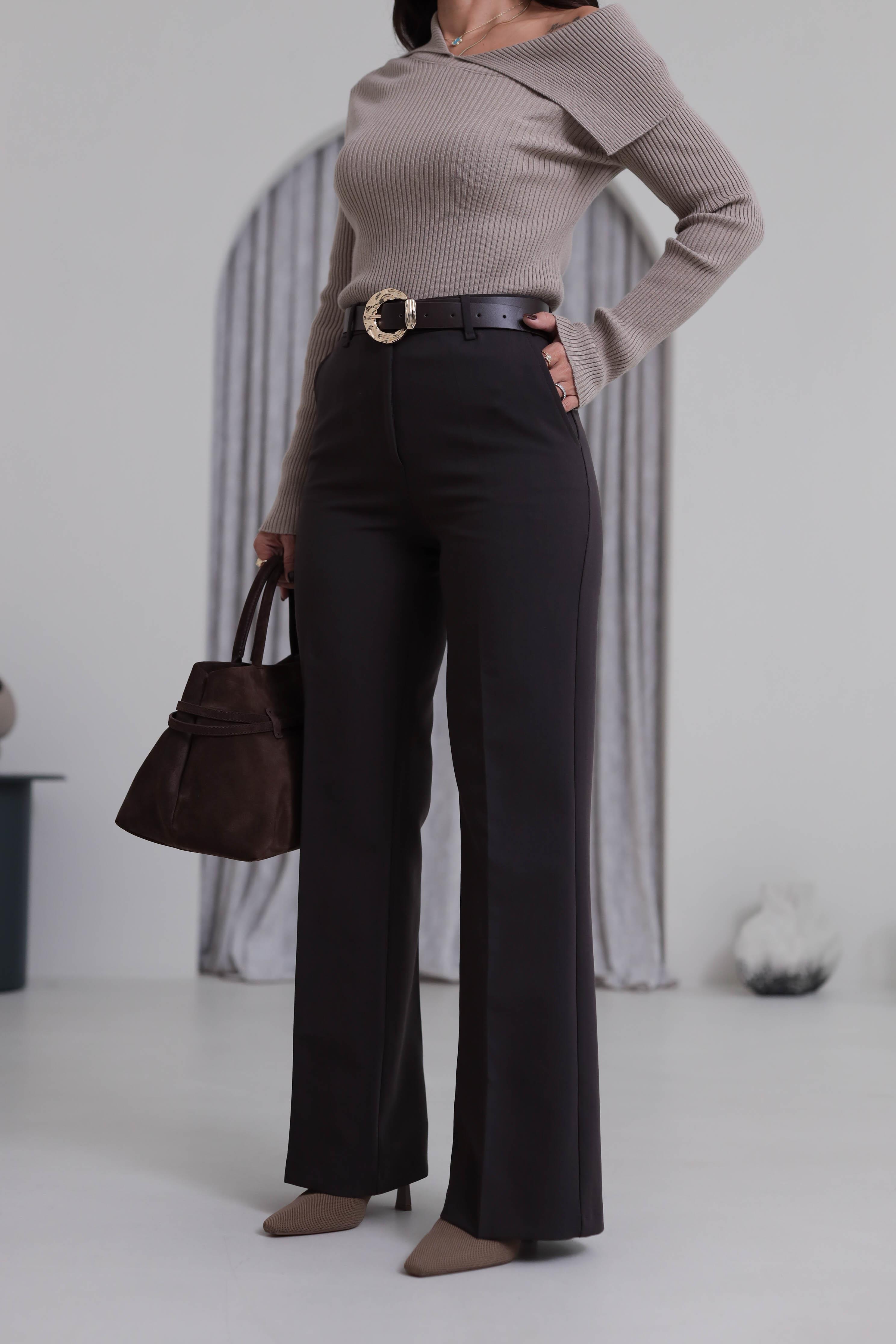 7038 Kemerli Kumaş Pantolon KOYU KAHVE (P-000007437)