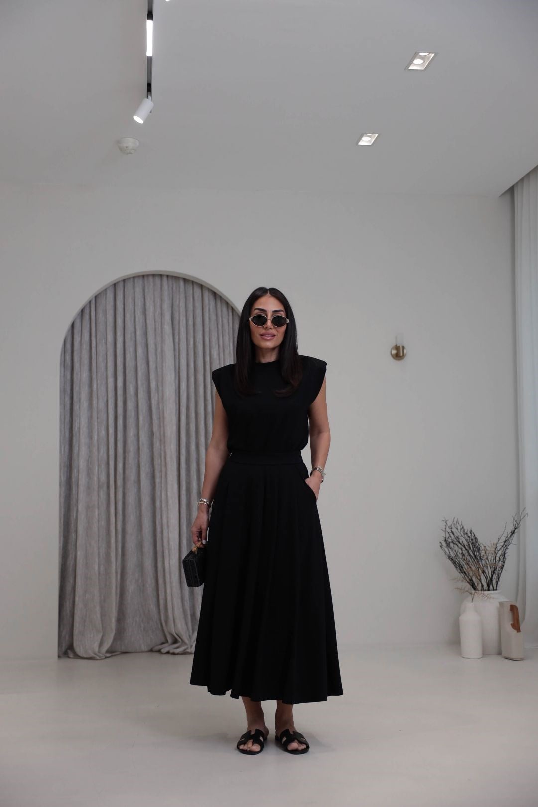 7150 Vatkalı Penye Bluz ve Pileli Etekli Takım SİYAH