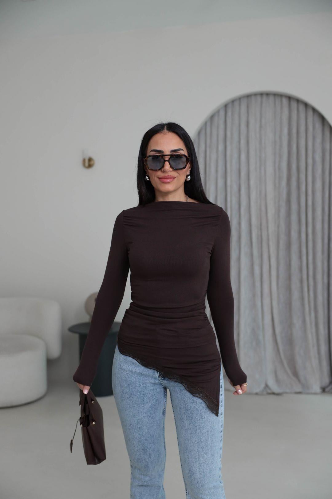 7505 Asimetrik Kesim Dantel ve Drape Detaylı Kayık Yaka Bluz ACI KAHVE