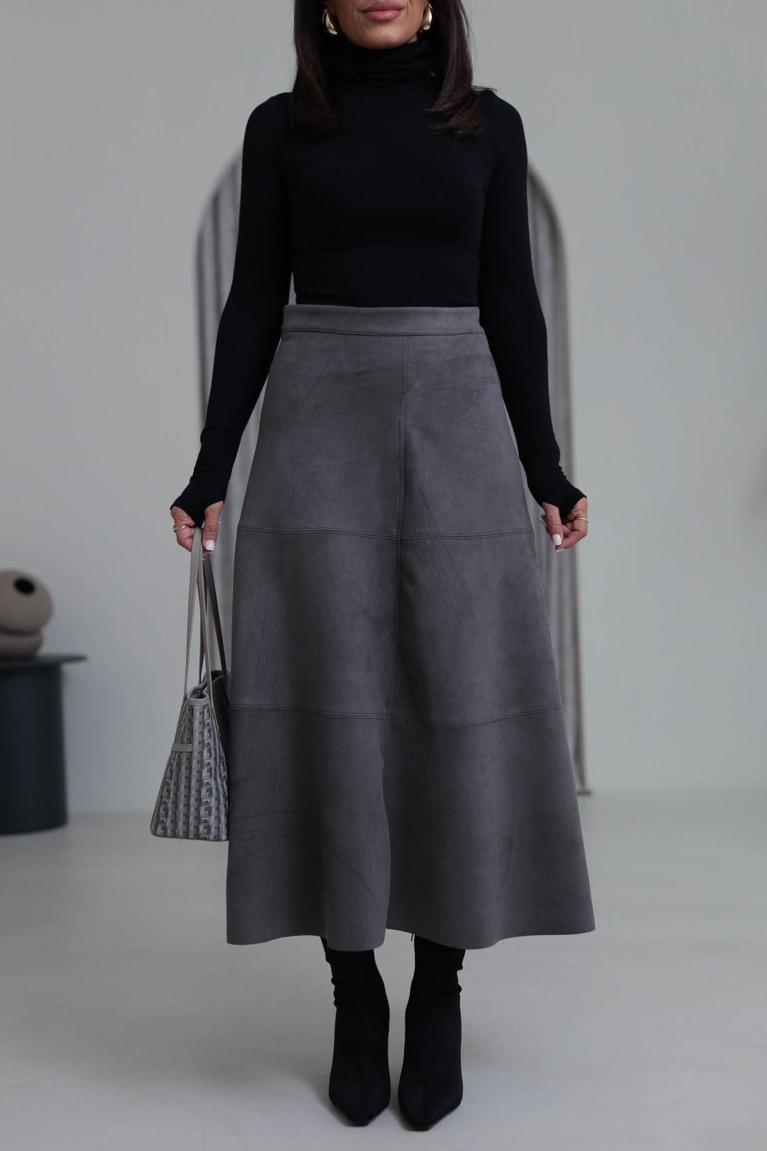 7547 Midi Boy Yüksek Bel Süet Etek GRİ