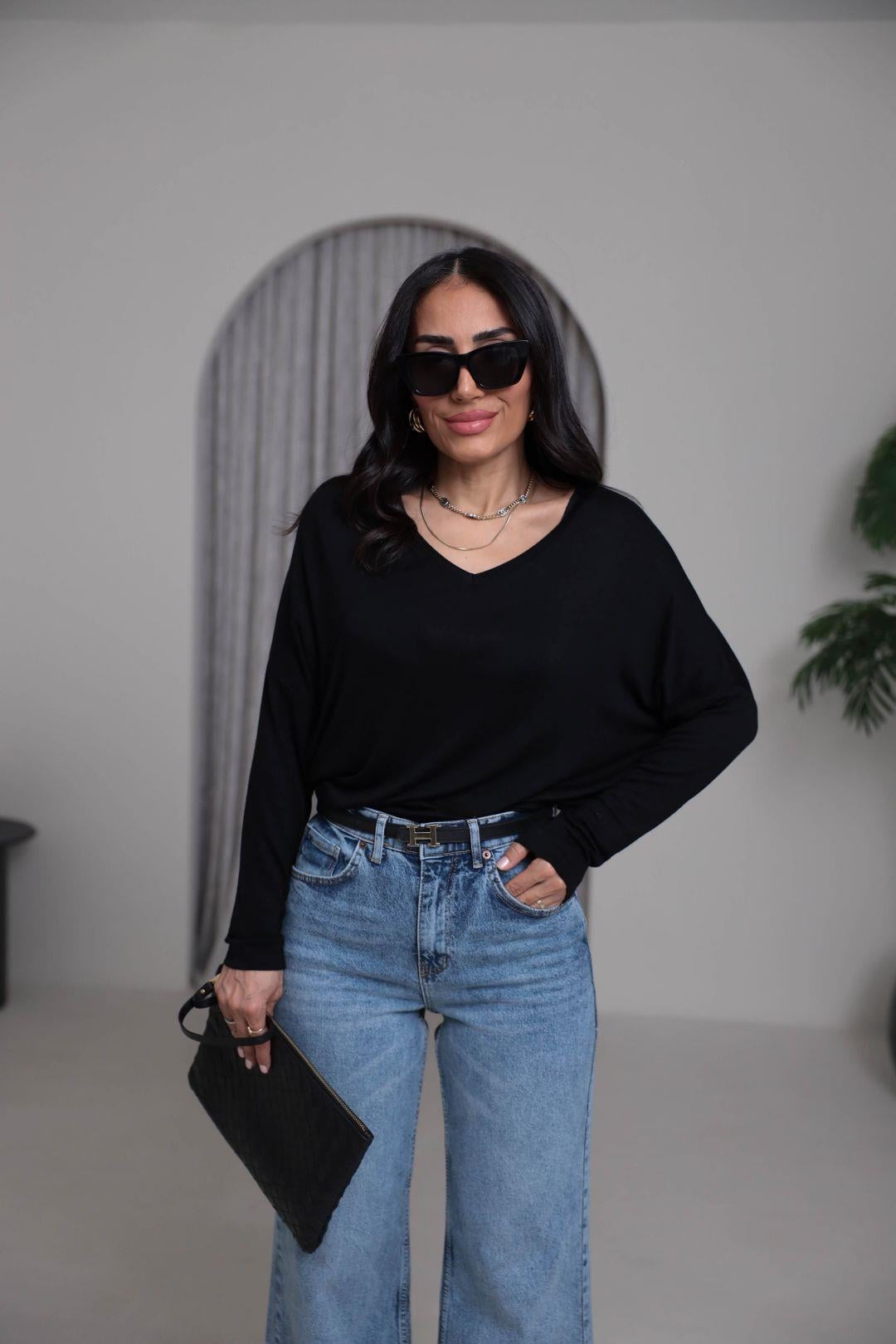 7590 V Yaka Yumoş Bluz SİYAH