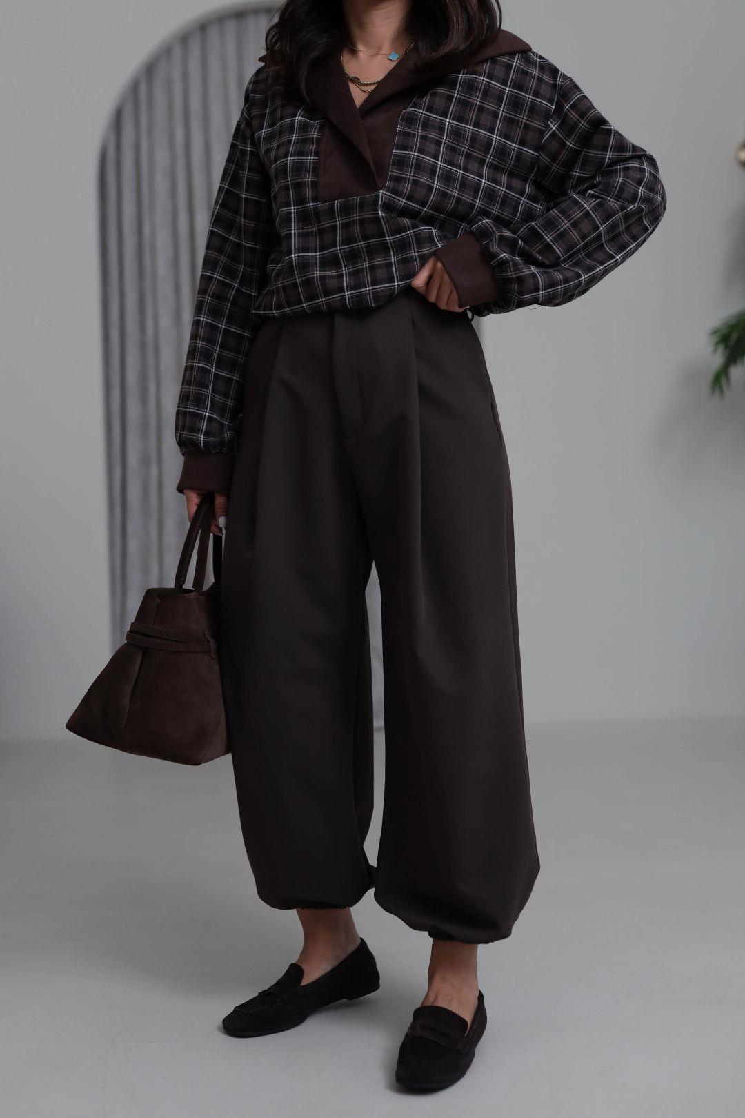 7708 Beli Pensli Paça Lastikli Pantolon ACI KAHVE