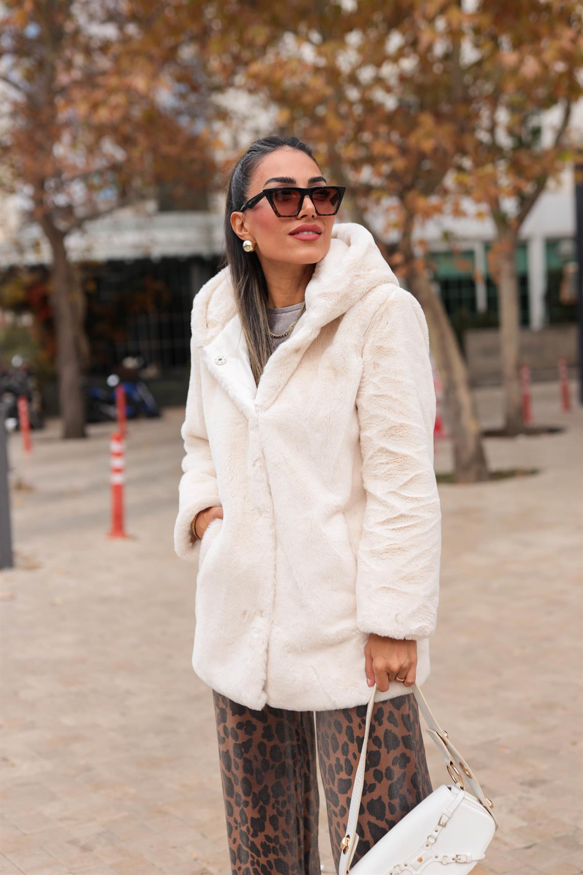 Kapşonlu Uzun Suni Kürk KREM (P-000007503)