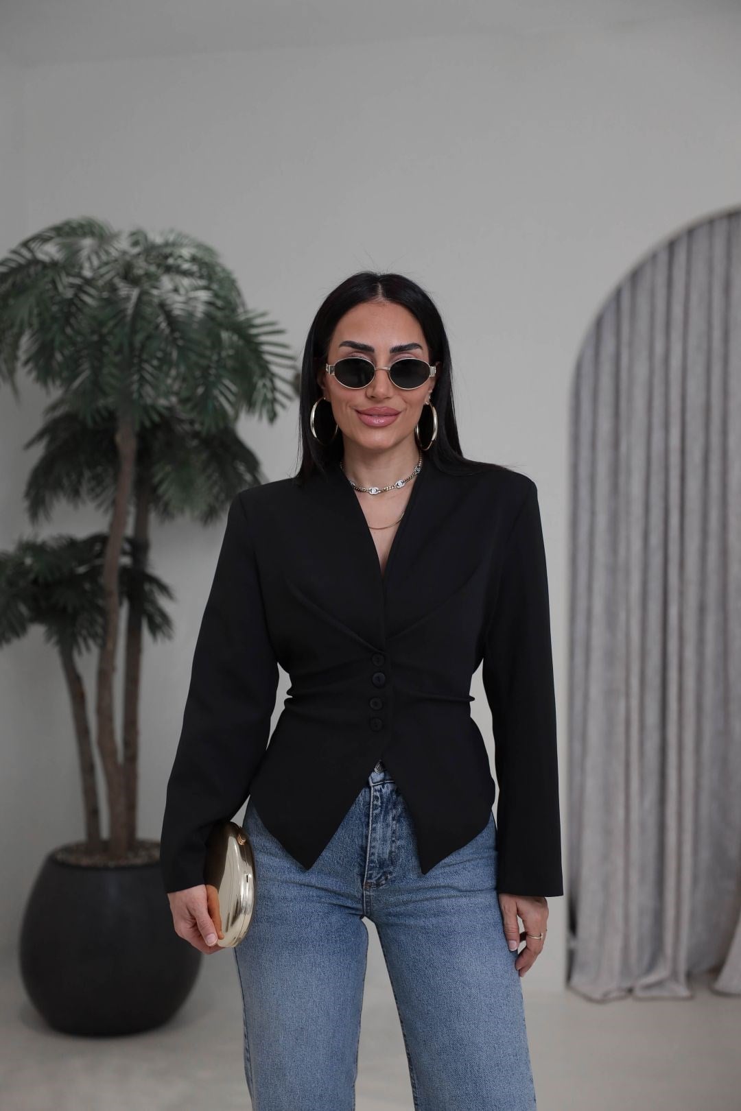 Vatkalı Asimetrik Belden Kuşaklı Ceket SİYAH
